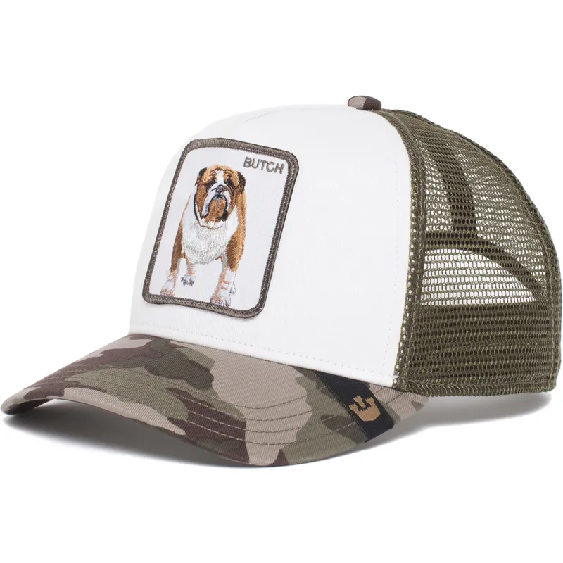 Weiße und Camouflage Bulldogge Hund Trucker Kappe The Butch The Farm von Goorin Bros.